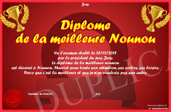 Envoyez par email votre Diplome de la meilleure Nounou personalisé