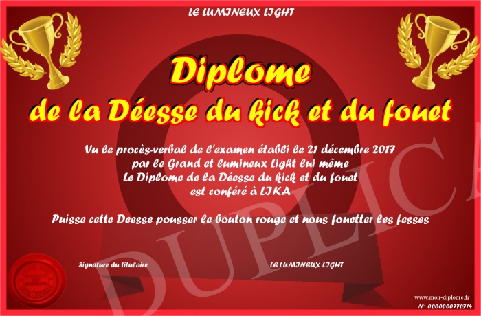 Envoyez par email votre Diplôme de la Déesse du kick et du fouet personalisé