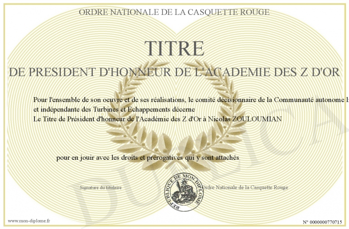 Envoyez par email votre Titre de Président d'honneur de l'Académie des Z d'Or personalisé