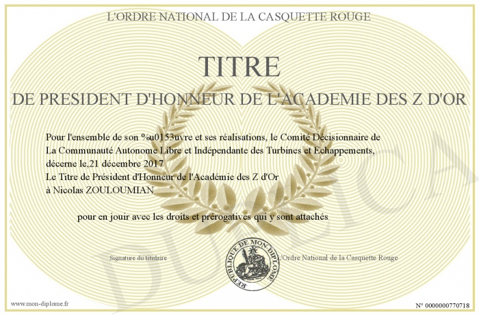 Envoyez par email votre Titre de Président d'Honneur de l'Académie des Z d'Or personalisé