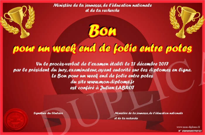 Envoyez par email votre Bon pour un week end de folie entre potes personalisé
