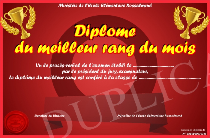 Envoyez par email votre Diplôme du meilleur rang du mois personalisé