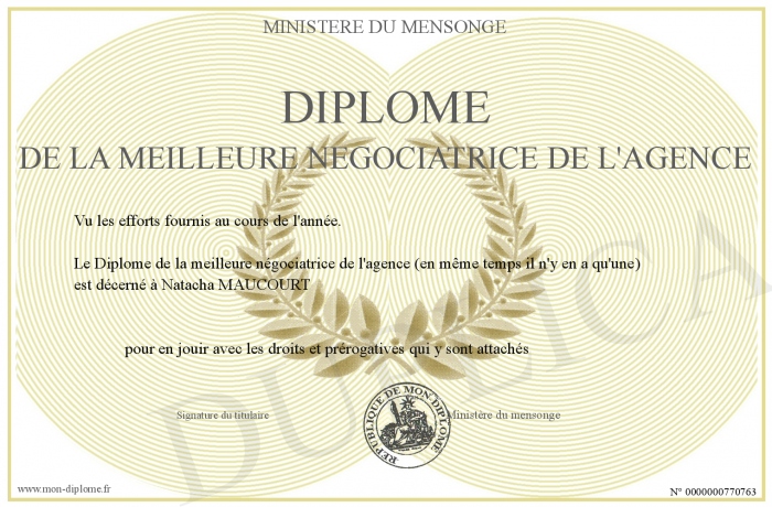 Envoyez par email votre Diplôme de la meilleure négociatrice de l'agence personalisé