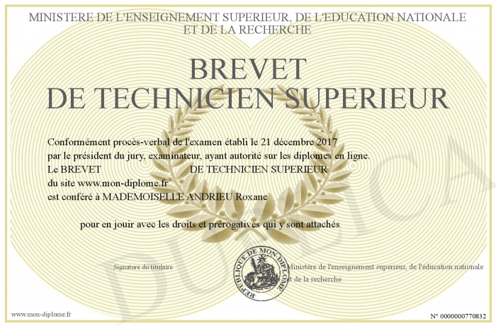 Envoyez par email votre BREVET DE TECHNICIEN SUPERIEUR personalisé