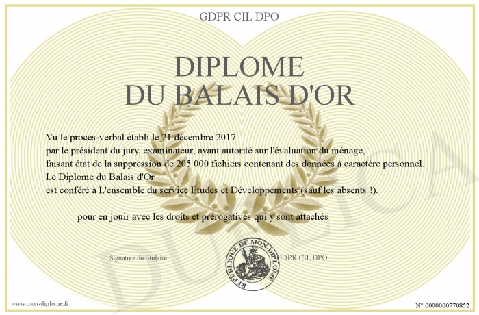 Envoyez par email votre Diplôme du Balais d'Or personalisé