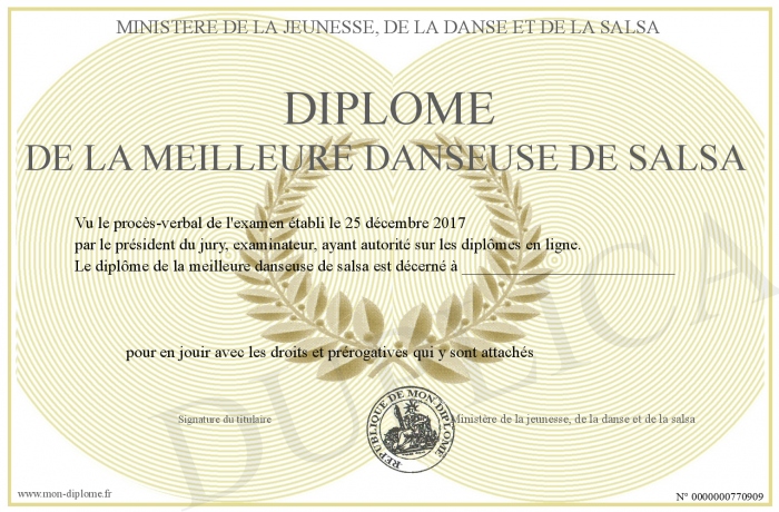 Envoyez par email votre Diplôme de la meilleure danseuse de salsa personalisé