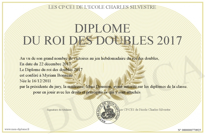 Envoyez par email votre Diplôme du roi des doubles 2017 personalisé