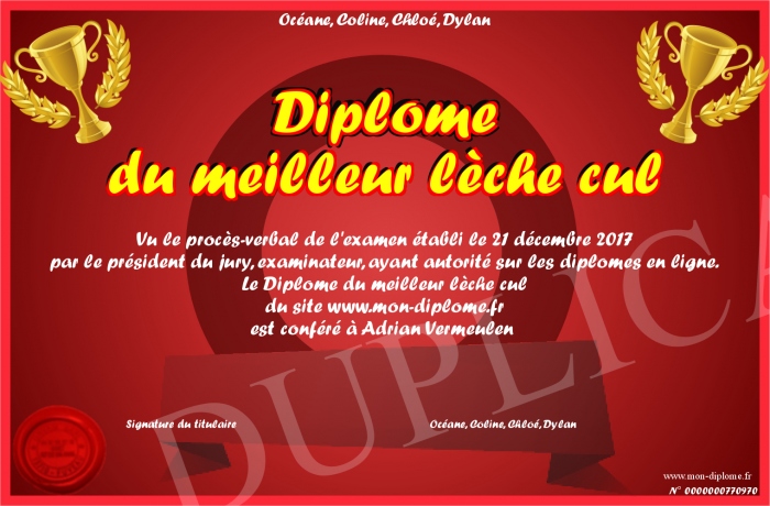 Envoyez par email votre Diplôme du meilleur lèche cul personalisé