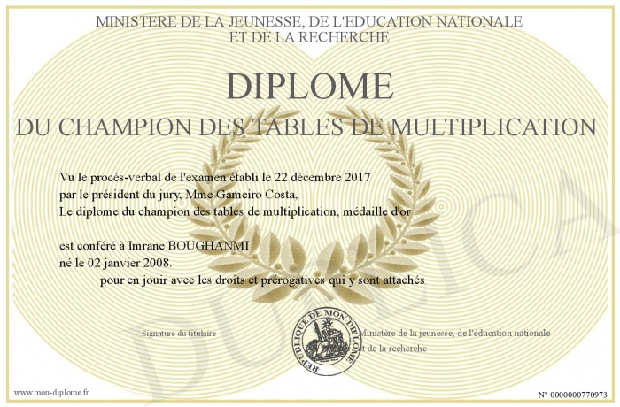 Envoyez par email votre Diplôme du champion des tables de multiplication personalisé