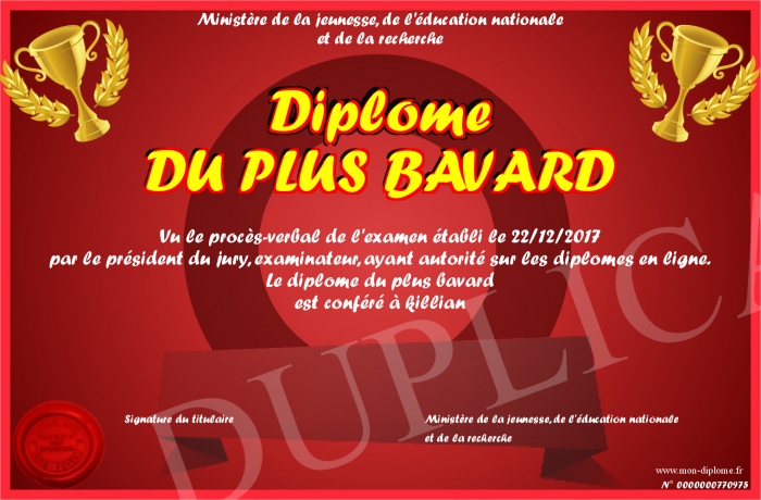 Envoyez par email votre Diplôme DU PLUS BAVARD personalisé