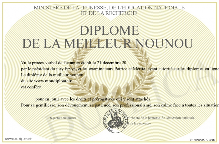 Envoyez par email votre Diplôme de la meilleur nounou personalisé