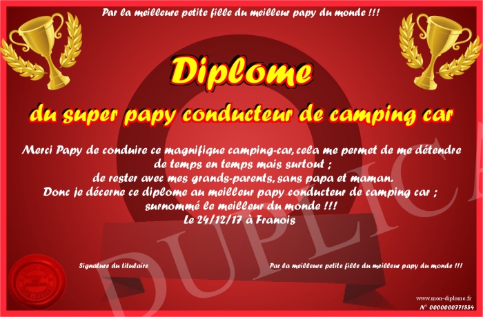 Envoyez par email votre Diplome du super papy conducteur de camping car personalisé