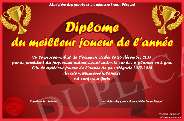 Envoyez par email votre Diplôme du meilleur joueur de l'année personalisé