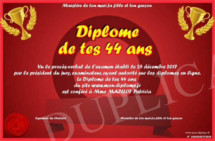 Envoyez par email votre Diplôme de tes 44 ans personalisé