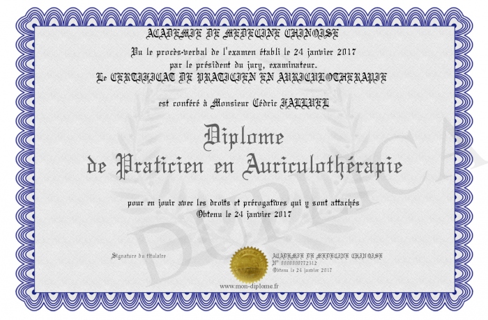 Envoyez par email votre Diplome de Praticien en Auriculothérapie personalisé