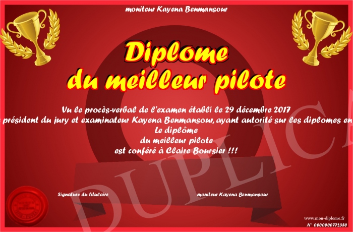 Envoyez par email votre Diplôme du meilleur pilote personalisé