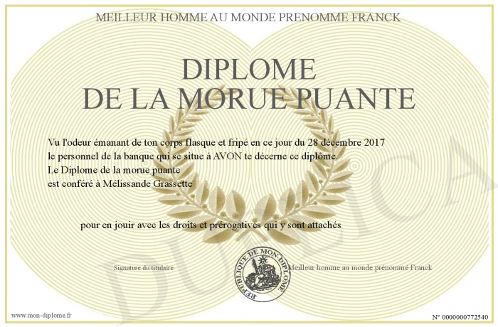 Envoyez par email votre Diplôme de la morue puante personalisé
