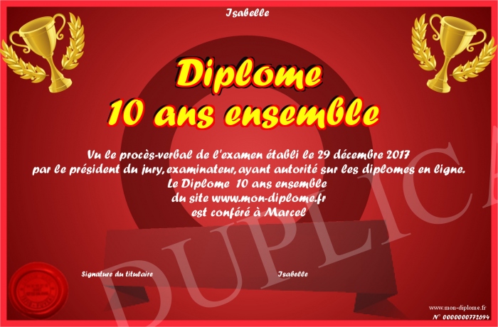 Envoyez par email votre Diplôme 10 ans ensemble personalisé