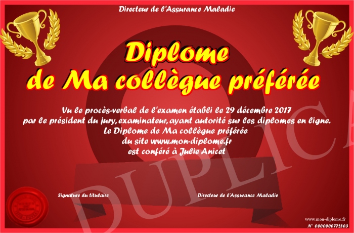 Envoyez par email votre Diplôme de Ma collègue préférée personalisé