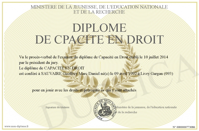 Envoyez par email votre Diplôme de Cpacité en droit personalisé