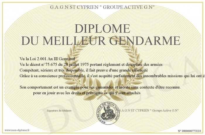 Envoyez par email votre Diplome du Meilleur Gendarme personalisé
