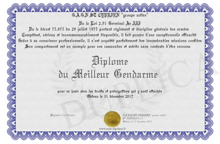 Envoyez par email votre Diplôme du Meilleur Gendarme personalisé