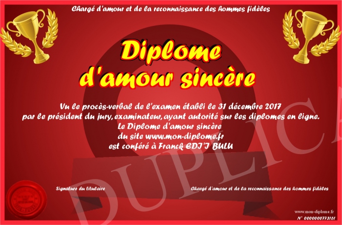 Envoyez par email votre Diplôme d'amour sincère personalisé