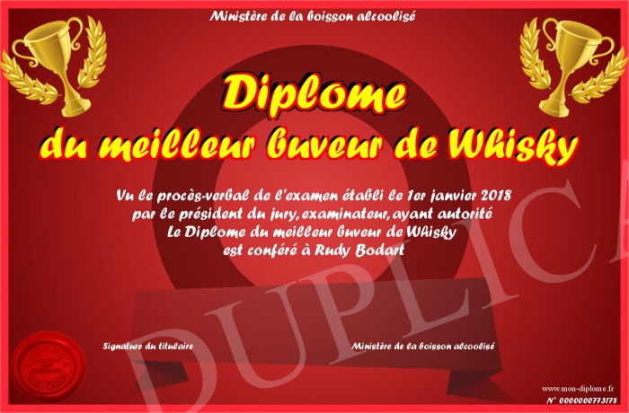 Envoyez par email votre Diplôme du meilleur buveur de Whisky personalisé