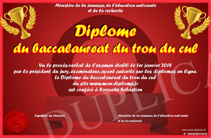 Envoyez par email votre Diplôme du baccalaureat du trou du cul personalisé
