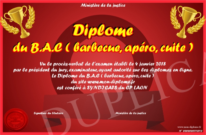 Envoyez par email votre Diplôme du B.A.C ( barbecue, apéro, cuite ) personalisé