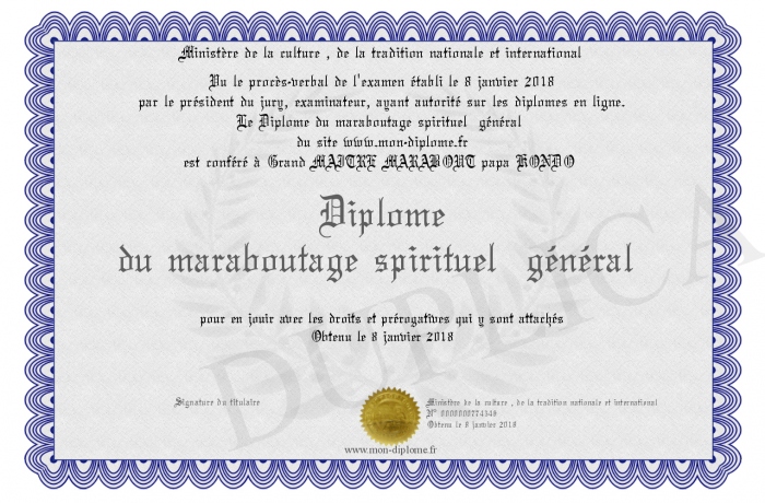 Envoyez par email votre Diplôme du maraboutage spirituel général personalisé