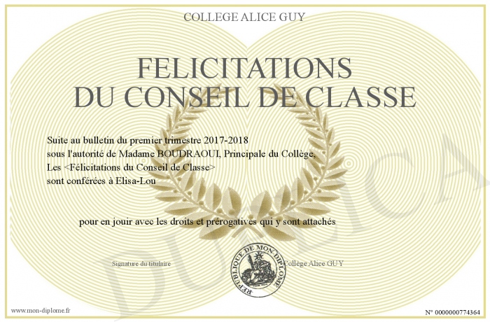 Envoyez par email votre Félicitations du Conseil de Classe personalisé