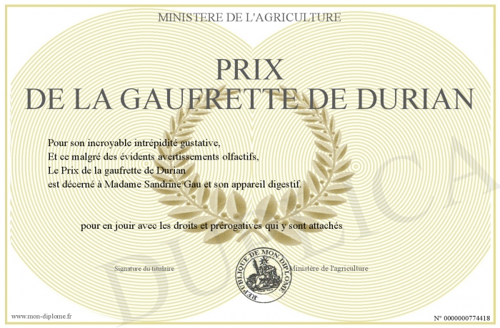 Envoyez par email votre Prix de la gaufrette de Durian personalisé