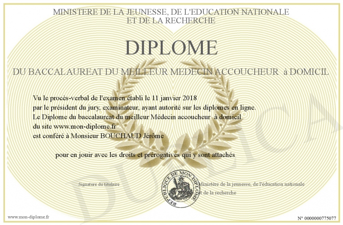 Envoyez par email votre Diplôme du baccalaureat du meilleur Médecin accoucheur à domicil personalisé