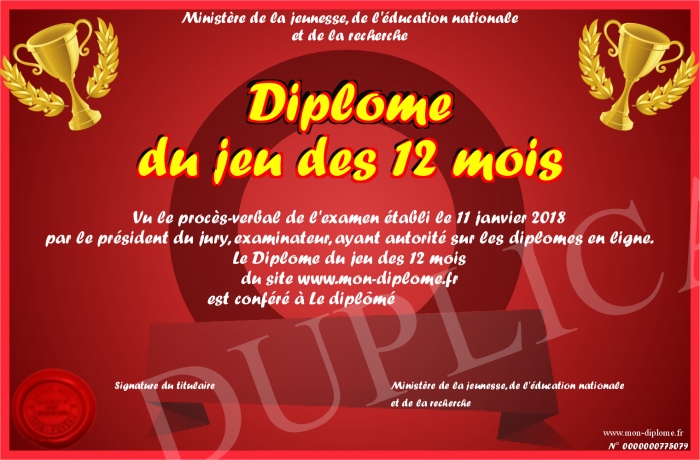 Envoyez par email votre Diplôme du jeu des 12 mois personalisé
