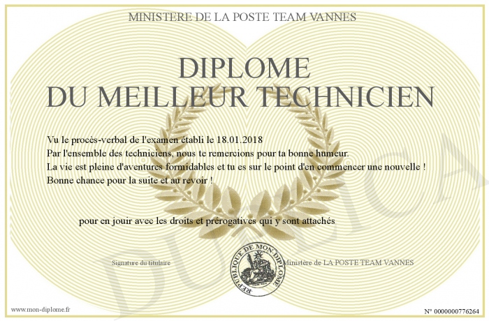 Envoyez par email votre diplôme du meilleur technicien personalisé