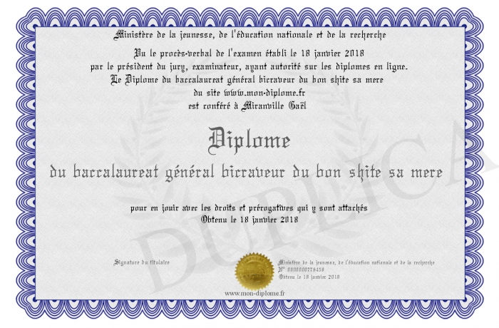 Envoyez par email votre Diplôme du baccalaureat général bicraveur du bon shite sa mere personalisé