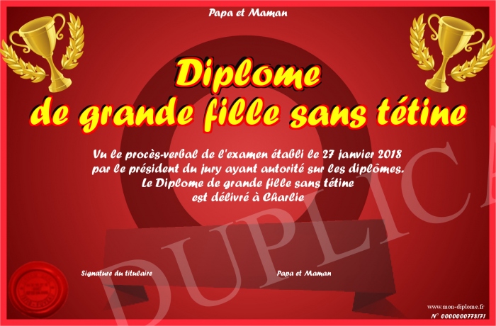 Envoyez par email votre Diplôme de grande fille sans tétine personalisé