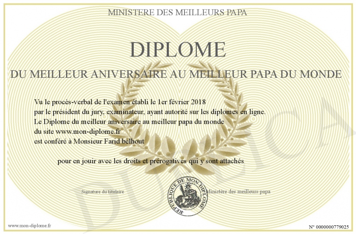 Envoyez par email votre Diplôme du meilleur aniversaire au meilleur papa du monde personalisé