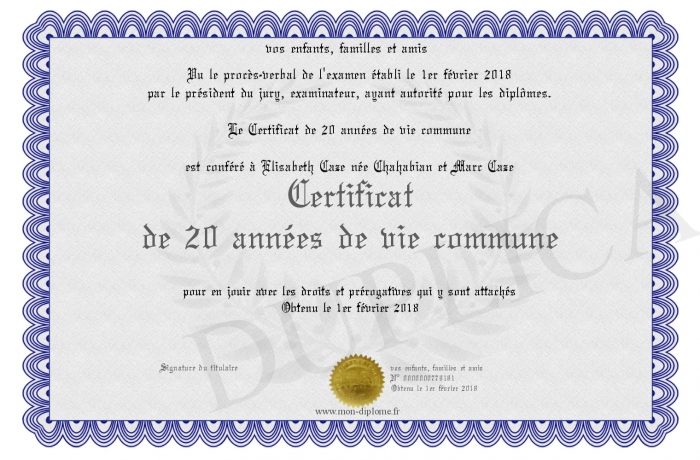 Envoyez par email votre Certificat de 20 années de vie commune personalisé