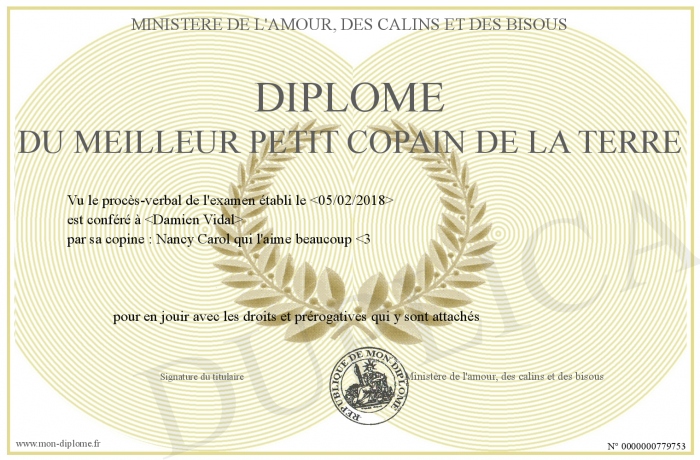 Envoyez par email votre Diplôme du meilleur petit copain de la terre personalisé