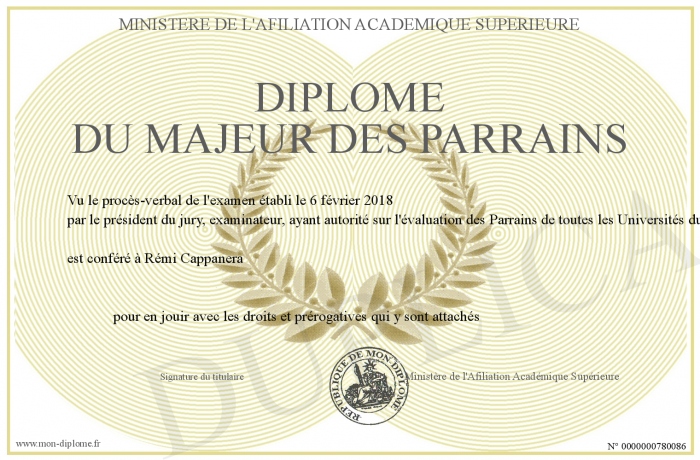 Envoyez par email votre Diplôme du Majeur des Parrains personalisé