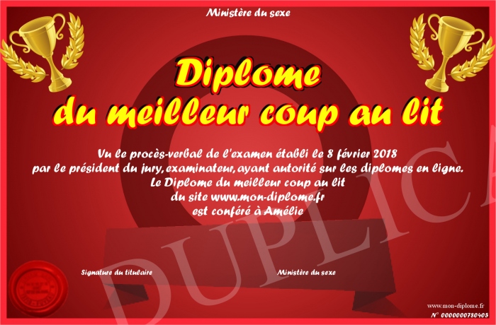 Envoyez par email votre Diplôme du meilleur coup au lit personalisé