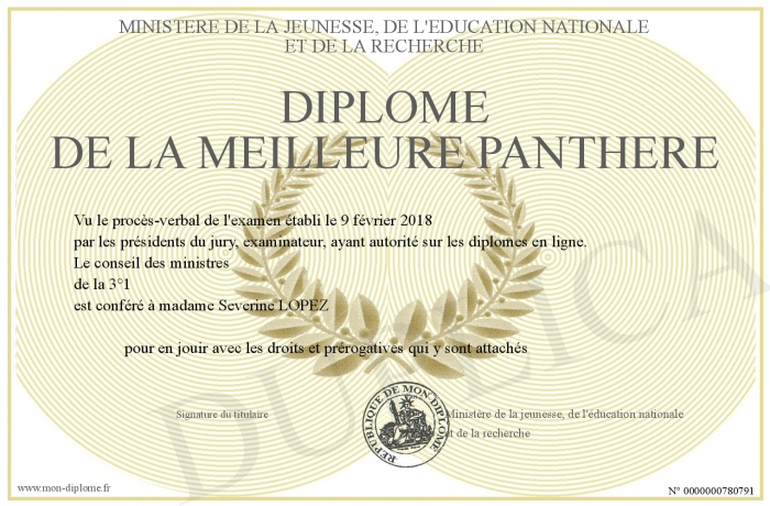 Envoyez par email votre Diplôme de la meilleure panthère personalisé
