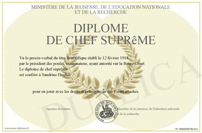 Envoyez par email votre Diplôme de Chef Suprême personalisé