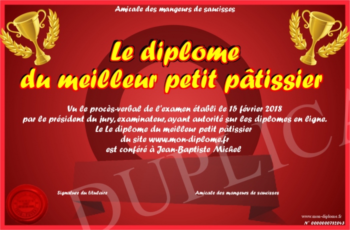 Envoyez par email votre Le diplôme du meilleur petit pâtissier personalisé