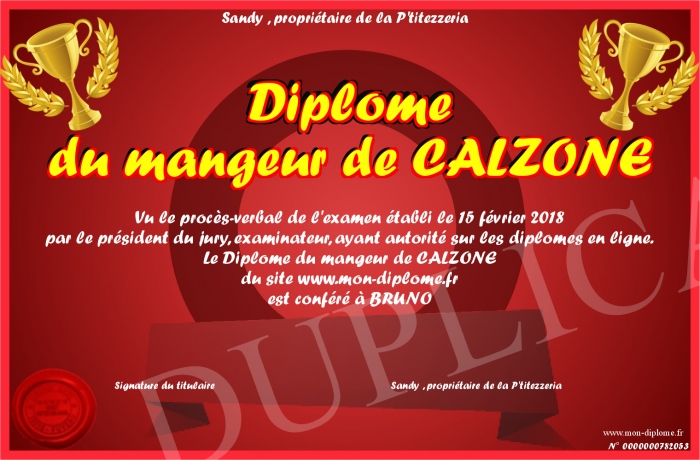 Envoyez par email votre Diplôme du mangeur de CALZONE personalisé