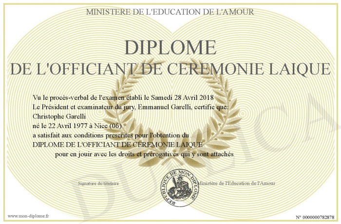 Envoyez par email votre Diplôme de l'Officiant de cérémonie laique personalisé