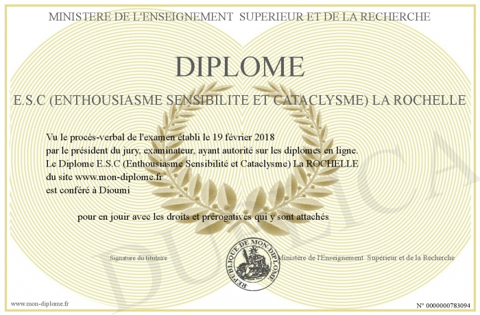 Envoyez par email votre Diplome E.S.C (Enthousiasme Sensibilité et Cataclysme) La ROCHELLE personalisé