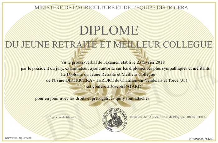 Envoyez par email votre Diplôme du Jeune Retraité et Meilleur Collègue personalisé